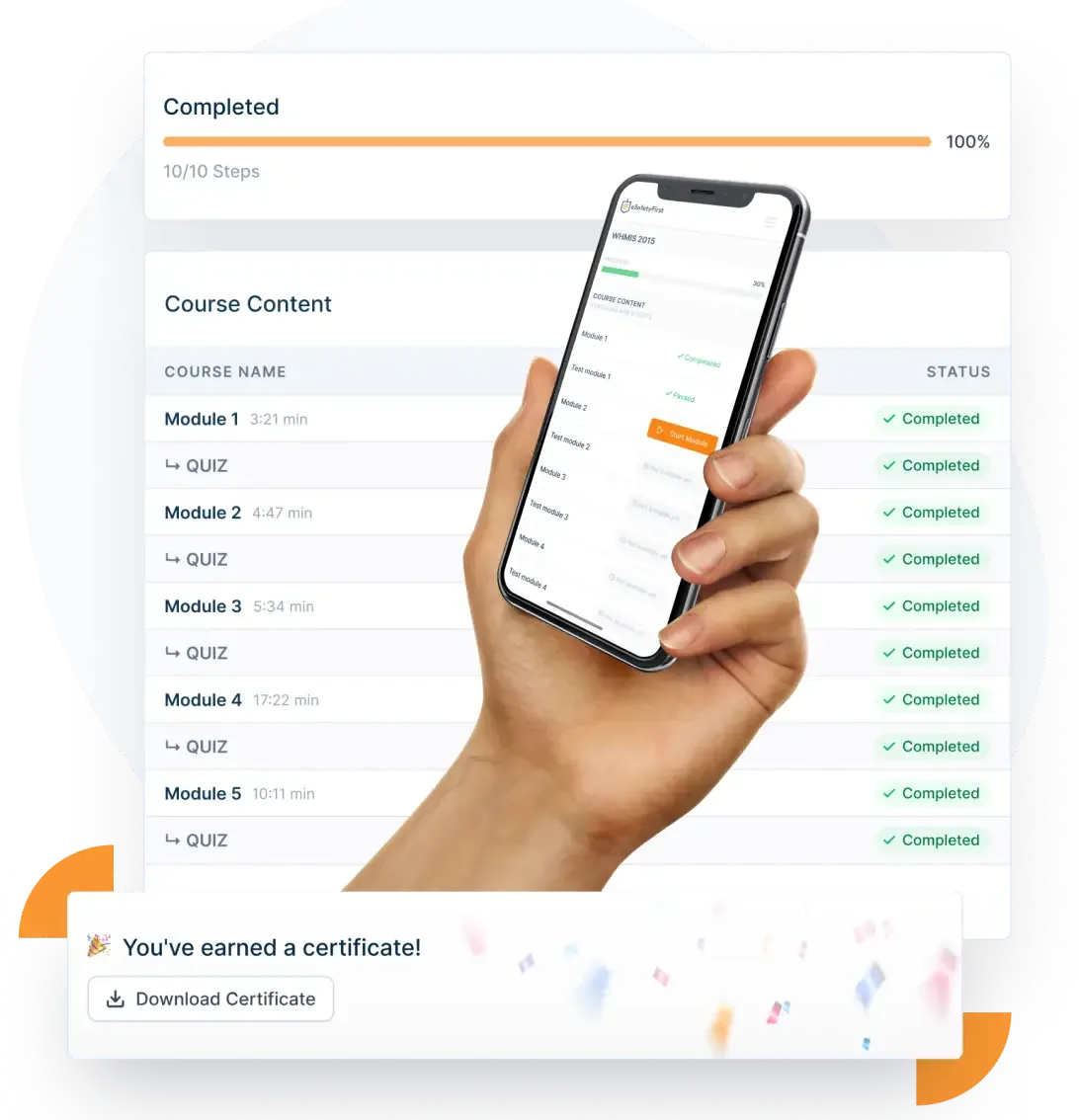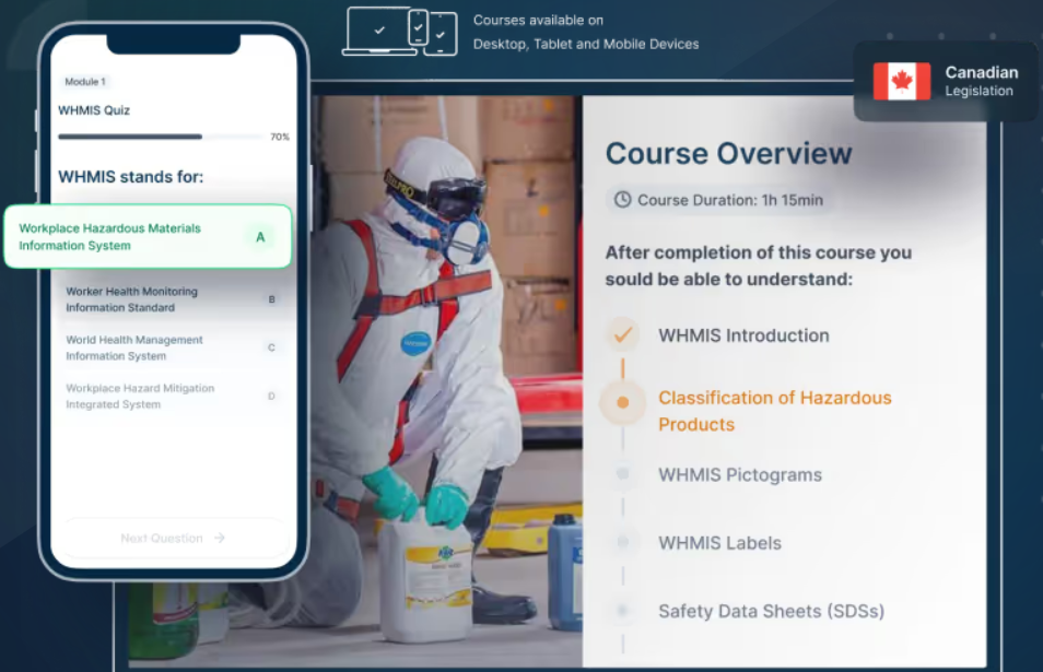 The WHMIS Training Course is perfect for workers who are starting a new job and need their WHMIS certificate, workers whose current employer has directed them to obtain a WHMIS certificate, workers who are renewing their current WHMIS certificate, and self employed workers. No scheduling is required! Complete your training in your own time with no more chasing instructors or scheduling appointments. Start, pause, and resume at your discretion – 100% pass rate with unlimited exam attempts.