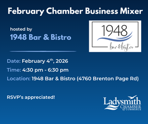 Your opinions do count and your voice should be heard! The Chamber provides an opportunity for the business community to make its opinions known to government representatives on Municipal, Regional, Provincial and Federal levels. Through membership polling, forums and feedback, your Ladysmith Chamber of Commerce works to provide leadership and direction for local business.