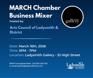 Our generous host, the Arts Council of Ladysmith & District, is Ladysmith’s most comprehensive visual arts organization. Bringing together artists and art lovers of all styles and mediums, ACLD offers dynamic exhibitions, a boutique gallery shop featuring local works, professional arts education programs for all ages, and signature events such as their juried Arts on the Avenue Festival. Their vibrant gallery space in the heart of downtown makes the perfect backdrop for an evening of business networking.