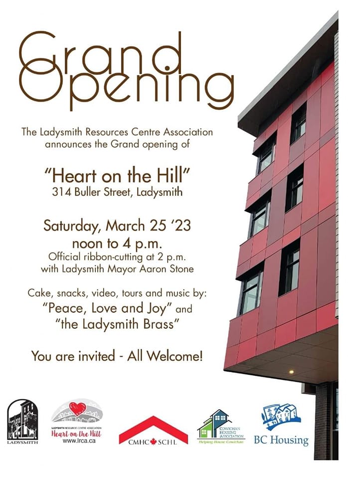 Drum roll please . . . grand opening of the LRCA Heart on the Hill building at the corner of Buller Street and Third Avenue is finally set. Mark Saturday, March 25 in your calendars, noon to 4 p.m. with an official ribbon-cutting at 2 p.m. (with Ladysmith Mayor Aaron Stone presiding). Cake, snacks, video, tours and music by local Peace Love Joy Band and Ladysmith Brass is already scheduled. The organizing team is looking forward to the community enjoying the new 36-unit affordable housing project.