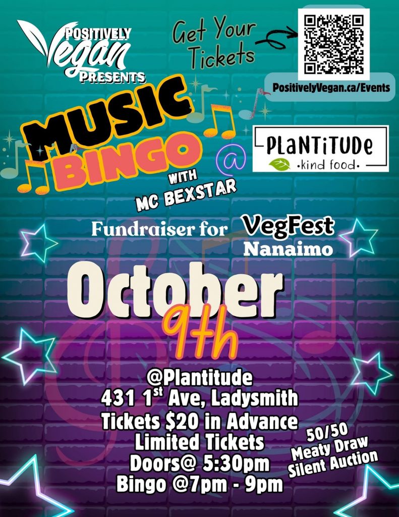 Join us for a night of music, bingo, and fun—all while supporting VegFests in BC. Hosted by the incredible MC Bexstar. This lively event at Plantitude is your chance to test your music knowledge, win prizes, and connect with friends. Date: October 9, 2025
