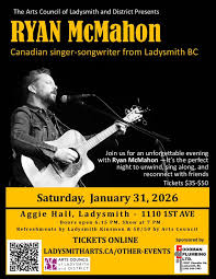 Enjoy a night out in downtown Ladysmith on Saturday January 31 starting at 7 PM, for live music with Ryan McMahon. Doors open at 6:15 PM. Refreshments will be provided by the Ladysmith Kinsmen. There will be a 50/50 hosted by the Arts Council of Ladysmith. This event is sponsored by Goodman Plumbing Ltd.