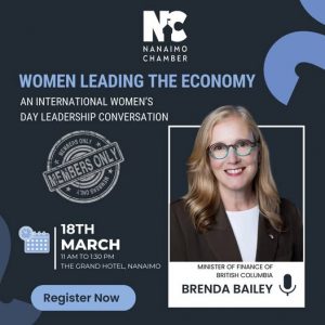 Join us on Wednesday, March 18 at the Grand Hotel Nanaimo for an inspiring International Women’s Day–themed luncheon featuring the Honourable Brenda Bailey. Minister Bailey will share insights on BC’s economic outlook, leadership, and the important role women play in shaping inclusive and resilient communities.